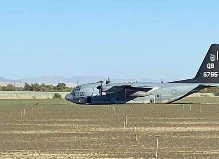 Очевидцы публикуют кадры, на которых самолет-заправщик KC-130J «Геркулес» лежит на земле после совершения аварийной посадки вблизи города Термал.