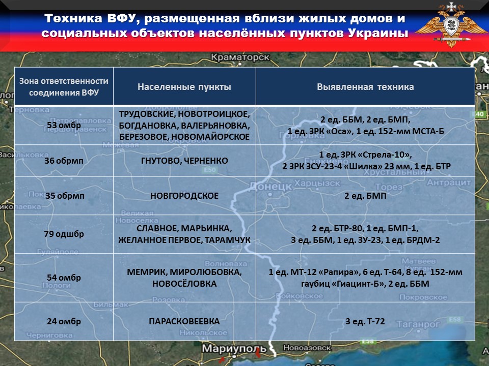Нашей разведкой подтверждаются факты размещения подразделениями ВСУ вооружения и военной техники вблизи жилых домов и муниципальных объектов на подконтрольной Украине территории, что также является нарушением третьего пункта дополнительных мер по поддержанию перемирия и подвергает опасности жизнь и здоровье мирных жителей.