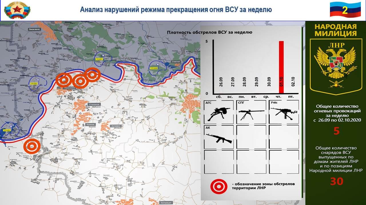 30 сентября с позиций 2-го батальона 14-й бригады из района н. п. Новотошковское в направлении н. п. Донецкий боевики осуществили семь выстрелов из АГС-17 и двенадцать выстрелов из крупнокалиберного оружия.