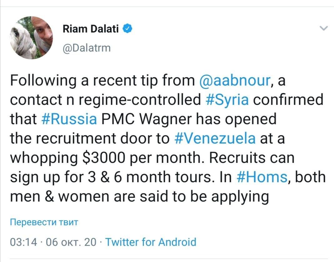 Так [по его словам] в сирийском Хомсе российская ЧВК «Вагнер» вербует местных по 3000 долларов (!) для командировки в Венесуэлу на срок от трех месяцев до полугода.
