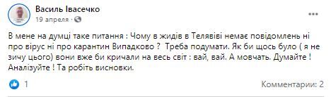 Тогда скриншот поста Ивасечко опубликовал директор Украинского еврейского комитета Эдуард Долинский. Он напомнил, что общество «Просвита», в котором состоит Ивасечко, финансируется из государственного бюджета. Ежегодно на него уходит более 1 миллиона долларов.