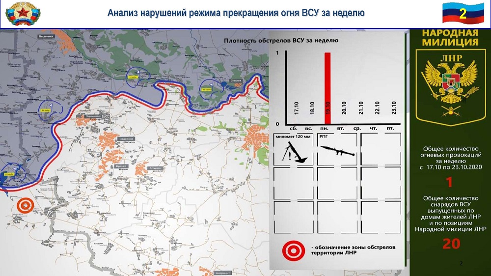 19 октября с позиций карателей 1-го механизированного батальона 24-й бригады ВСУ, в районе н. п. Луганское по н. п. Калиновка было выпущено одиннадцать 120-мм мин и девять гранат РПГ-7.