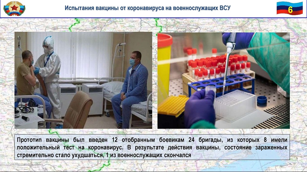 По имеющейся у нас информации, в одной из лабораторий, расположенной в районе н. п. Старобельск на базе медицинского центра Medical City, проводились испытания на военнослужащих ВСУ, заразившихся коронавирусной инфекцией, на предмет взаимодействия организма человека с вакциной.
