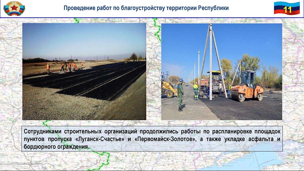 Сотрудниками строительных организаций продолжились работы по распланировке площадок пунктов пропуска «Луганск — Счастье» и «Первомайск — Золотое», а также укладке асфальта и бордюрного ограждения. Также сотрудниками коммунального предприятия «Лугансквода» проводились аварийно-восстановительные и плановые работы на объектах жизнеобеспечения в н. п. Зеленая Роща.