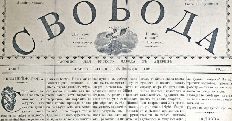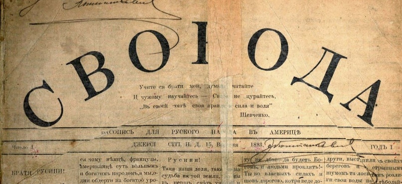 Что мы видим? Заголовок: «Свобода». Чуть ниже: «Часопись для руского народа въ Америце». И ниже по тексту: «Русины, братья русины, русские в Америце, народ русский, Американская русь» и т. д. и т. п.