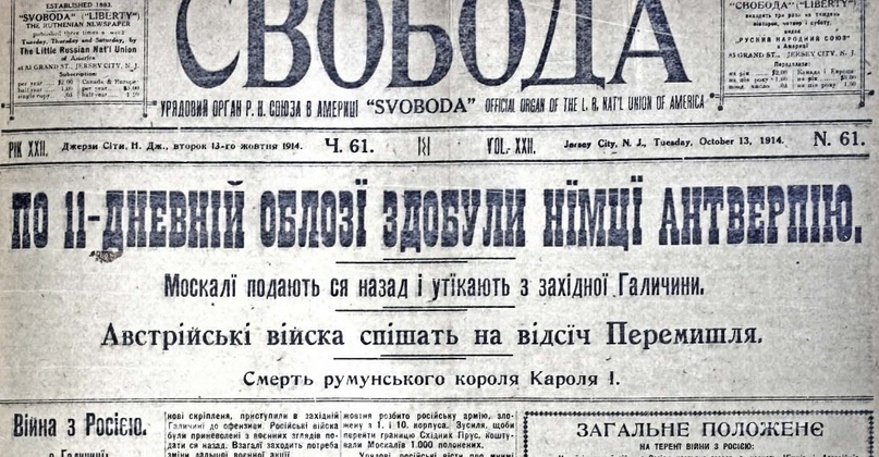 Номер шестьдесят второй за 15 октября 1914 года. Выпуск газеты, который вышел всего лишь через два дня после предыдущего… И что мы видим в названии газеты, немного ниже названия «Свобода»? Правильно — «Орган У. Н. (Украинского Народного) Союза в Америке»! И чтобы не было кривотолков, правее — надпись на английском: «Official organ of the UKR nat’l ass’n of America»! Но может быть, нам показалось, и в других номерах газеты всё вернулось на «круги своя», на «русские круги»?..