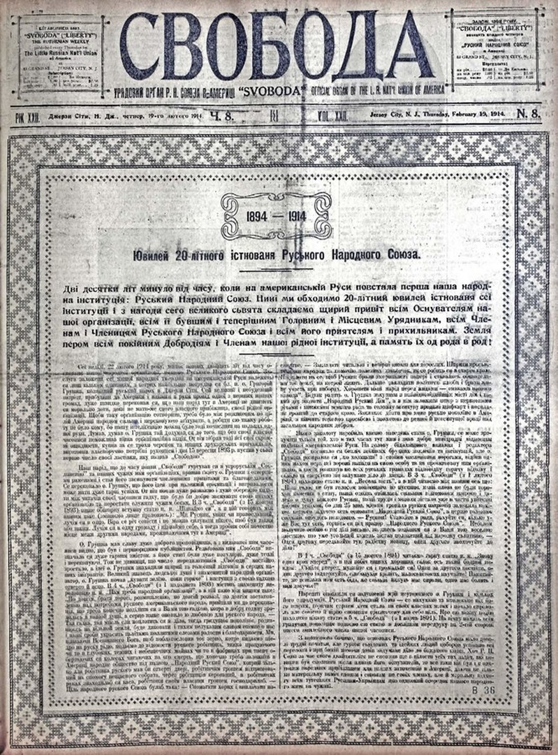 «1894–1914. Юбилей 20-летнего существования Русского Народного Союза. Два десятка лет прошло с тех пор, когда на американской Руси возникла первая наша народная институция: Русский Народный Союз.