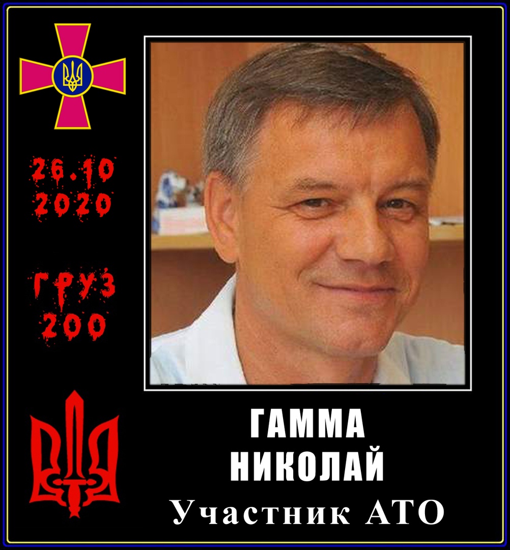 26.10.2020 — Гамма Николай Афанасьевич, 1956 г. р., участник «АТО», полковник медицинской службы. С 2015 года добровольно отправился в зону «АТО»/«ООС», где спасал украинских военных преступников.