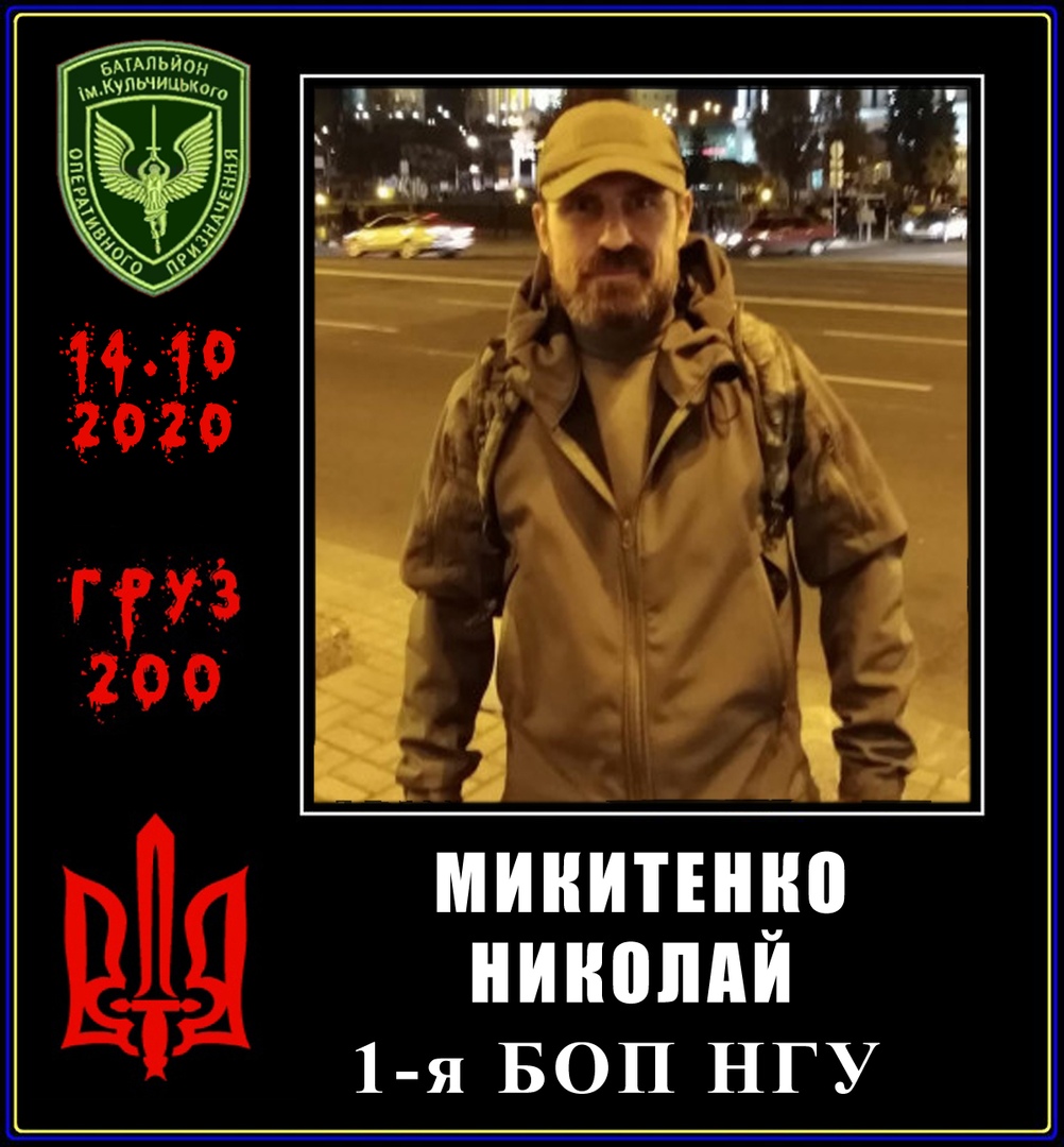 14.10.2020 — Микитенко Николай Николаевич, 1971 г. р., участник «АТО», 1 БОП НГУ имени Кульчицкого. С 2014 года добровольно отправился в зону «ООС», где за деньги истреблял мирное население Донбасса. Во время эвакуации сбитого вертолета на горе Карачун был ранен. После лечения, несмотря на полученную инвалидность, снова отправился в зону «ООС».
