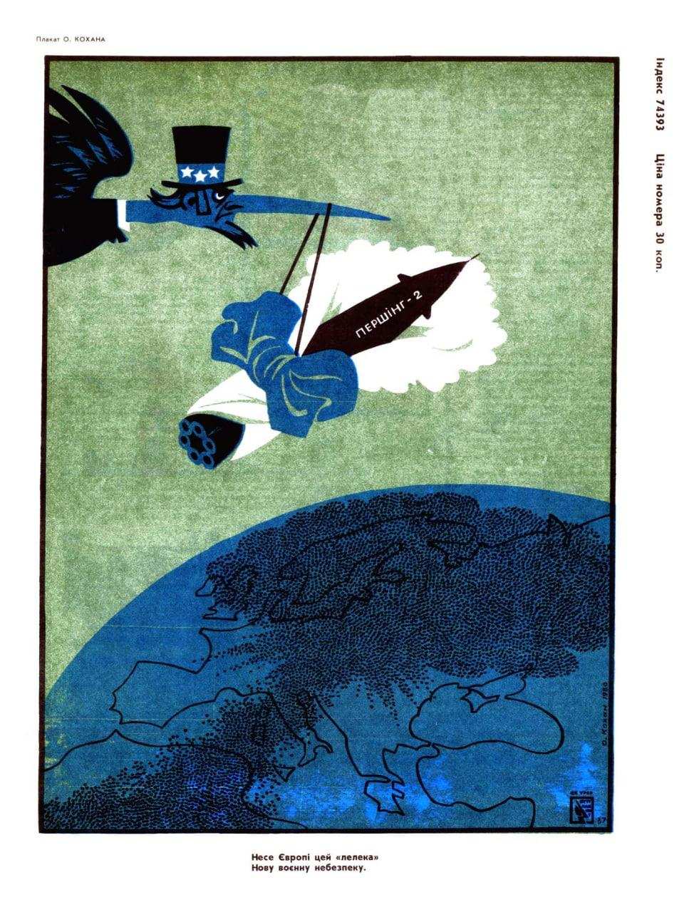 Кохан, в частности, рисовал украинского националиста, который в шапке с лентой цветов государственного флага и с чемоданом, на котором изображены свастика, герб Украины, символика дивизии СС «Галичина» и логотип «Радио Свобода», пытается продать душу черту в бабочке цвета американского флага.