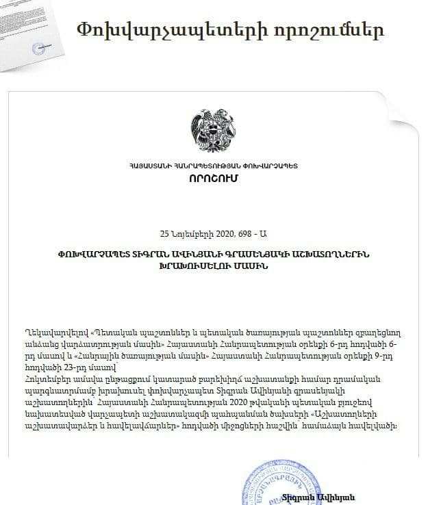 Кроме того, сегодня вице-премьер Тигран Авинян подписал распоряжение о премировании сотрудников своего аппарата «за добросовестный труд». Соответствующее решение опубликовали на сайте правительства.