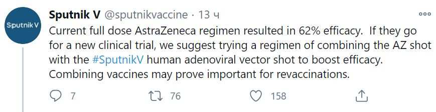 «В настоящее время вакцина AstraZeneca показывает 62% эффективности. Если они будут проводить новое клиническое испытание, то мы предлагаем комбинировать укол AstraZeneca со “Спутником V” для повышения эффективности», — написали разработчики российской вакцины на странице «Спутник V» в Twitter.