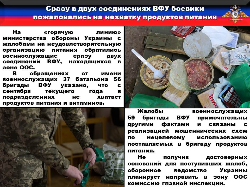 В обращениях от имени военнослужащих 37-го батальона 56-й бригады ВСУ указано, что с сентября текущего года в подразделениях не хватает продуктов питания, на позиции выделяется лишь 5 литров воды на 10 человек, а несбалансированный рацион питания личного состава приводит к различным заболеваниям среди личного состава. Бойцы потребовали обеспечить их фруктами и кисломолочными продуктами.