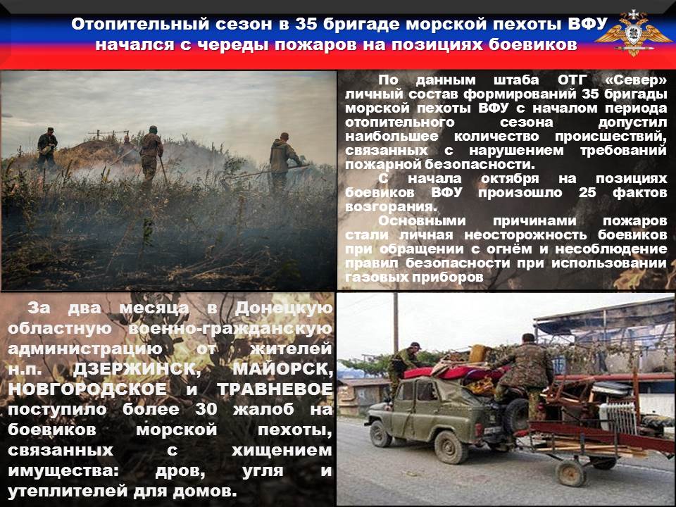 По данным штаба ОТГ «Север», личный состав формирований 35-й бригады морской пехоты ВСУ с началом периода отопительного сезона допустил наибольшее количество происшествий, связанных с нарушением требований пожарной безопасности.