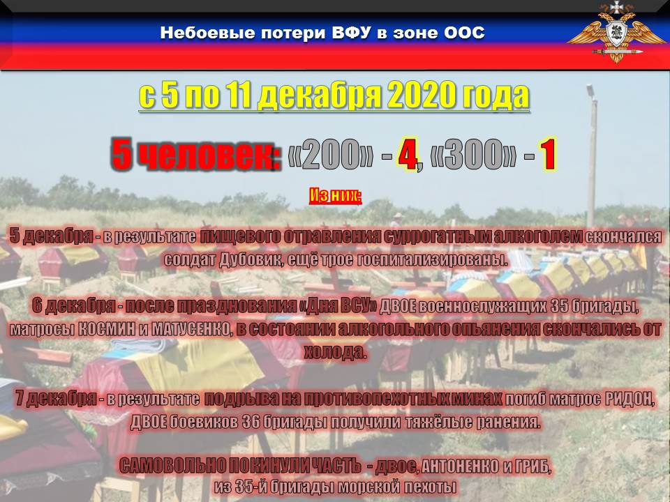♦ 5 декабря в результате пищевого отравления суррогатным алкоголем скончался солдат Дубовик, трое боевиков 72-й бригады госпитализированы;