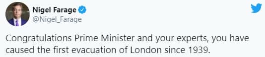 «Поздравляю премьер-министра и правительственных экспертов, вы стали причиной первой с 1939 года эвакуации из Лондона», — написал лидер Партии Brexit Найджел Фараж в Twitter.