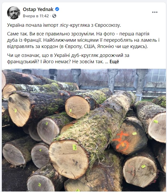 «Украина начала импорт леса-кругляка из Евросоюза. Именно так. Вы всё правильно поняли», — написал экоактивист на своей странице в соцсети.
