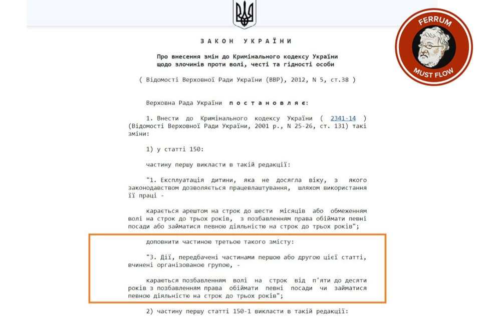 Статья 150 Уголовного кодекса Украины предусматривает санкцию от 5 до 10 лет лишения свободы за эксплуатацию нескольких детей.