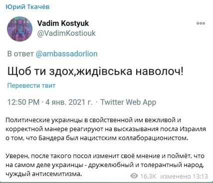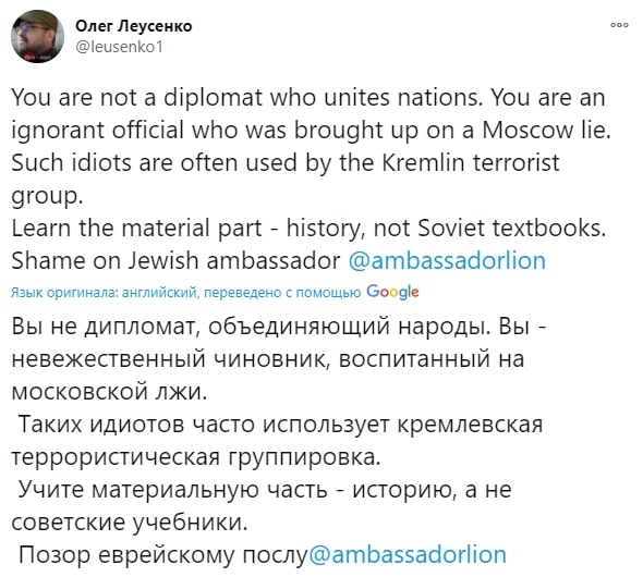 «Вы не дипломат, объединяющий народы. Вы — невежественный чиновник, воспитанный на московской лжи. Таких идиотов часто использует кремлевская террористическая группировка. Учите материальную часть — историю, а не советские учебники. Позор еврейскому послу», — написал гневное послание Леусенко.