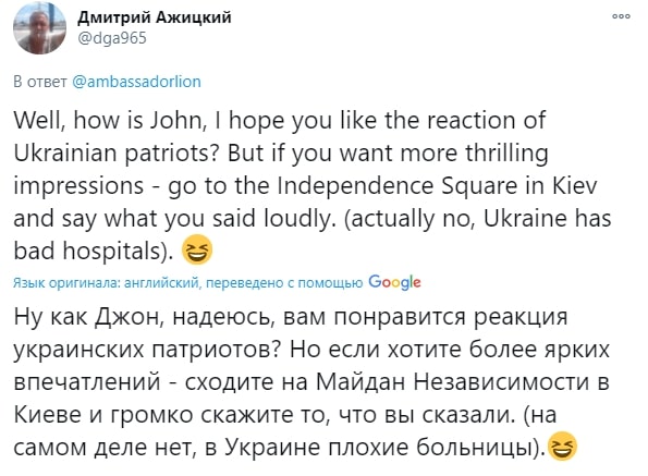 «Ну, как Джон (имя посла — Джоэль, Ред.), надеюсь, вам понравилась реакция украинских патриотов? Но если хотите более ярких впечатлений — сходите на Майдан Независимости в Киеве и громко скажите то, что вы сказали (на самом деле — лучше не говорите, потому что в Украине плохие больницы)».
