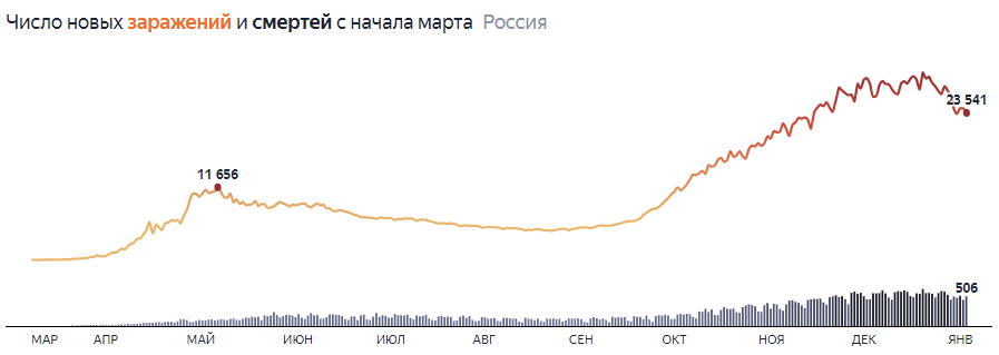 За последние сутки в России выявлен 23 541 новый случай заражения коронавирусом, общее число заболевших в нашей стране с начала эпидемии достигло 3 332 142.