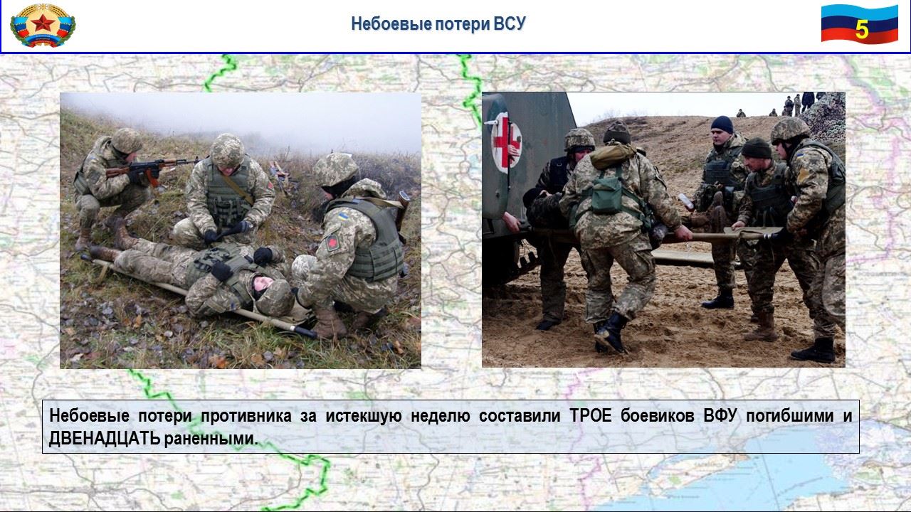 Всего по информации от нашего источника в штабе ОТГ «Север», небоевые потери противника за истекшую неделю составили трое военнослужащих ВСУ погибшими и двенадцать раненными, в том числе: