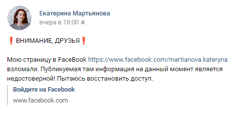 «ВНИМАНИЕ, ДРУЗЬЯ. Мою страницу в Facebook взломали. Публикуемая там информация на данный момент является недостоверной! Пытаюсь восстановить доступ».