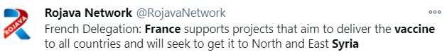 Глава делегации Франции директор центра кризисных ситуаций и поддержки национального министерства иностранных дел уведомил о намерении французской стороны рассмотреть вопрос о поставке вакцины от COVID-19 на территорию Заевфратья, а также о планах оказать содействие курдской стороне в стабилизации обстановки в регионе.
