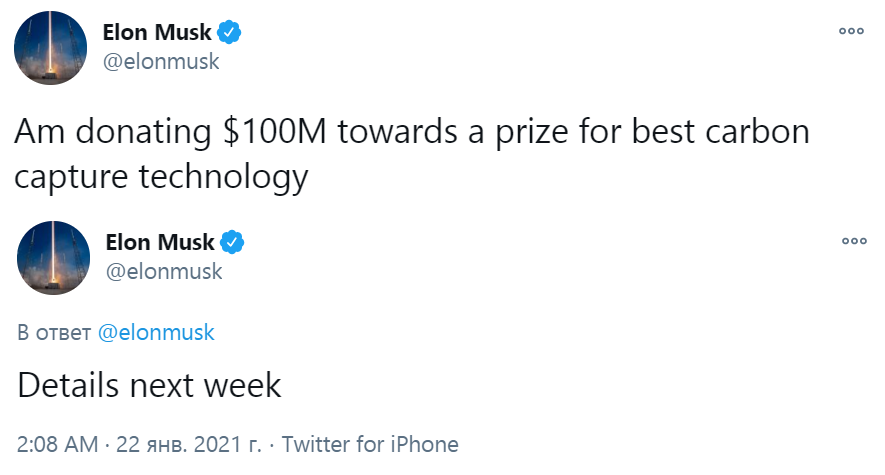 «Я пожертвую 100 миллионов долларов в качестве приза за лучшую технологию улавливания углерода», — написал Маск, добавив, что подробности предложения будут раскрыты на следующей неделе.