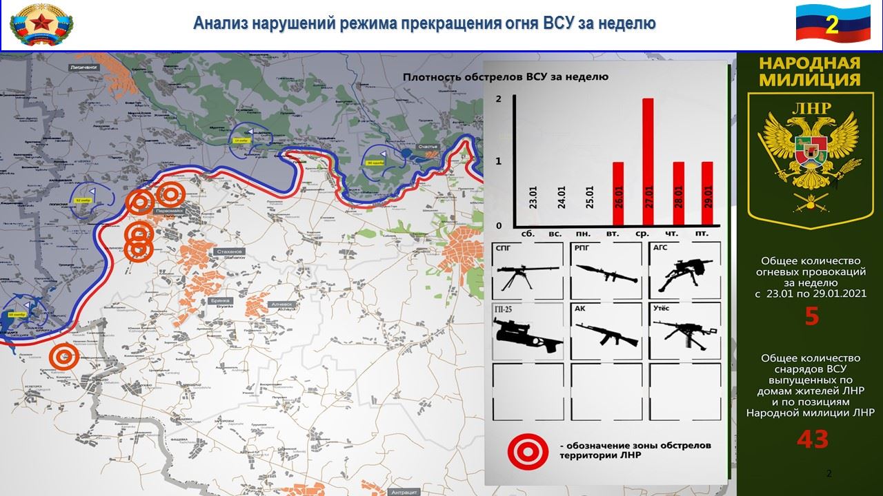По данным наблюдателей представительства ЛНР в СЦКК, в период с 23 по 29 января 2021 года зафиксировано пять огневых провокаций со стороны ВСУ.