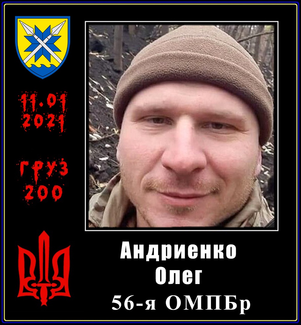 11.01.2021 — Андриенко Олег Витальевич, 1983 г. р., старший солдат, стрелок-помощник гранатометчика подразделения 37-го ОМПБ 56-й ОМПБр. Свою расплату за жизни невинно убиенных мирных жителей Донбасса получил на боевом посту в районе поселка Пески в виде пули (как пишут «захысныки» — пуля была «снайперской»). На родине «героя и защитника незалежной» в г. Запорожье Запорожской области остались сын, мать, жена.