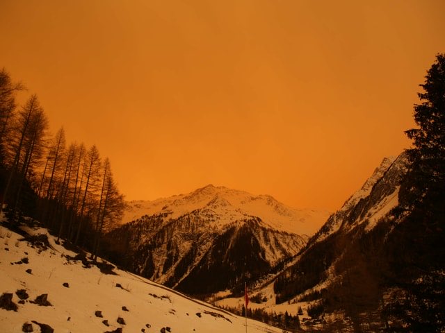 Кадры, снятые в европейских городах и на знаменитых горнолыжных курортах, выглядят весьма апокалиптично: в оранжевый цвет окрасились небо, снег, дома и машины.