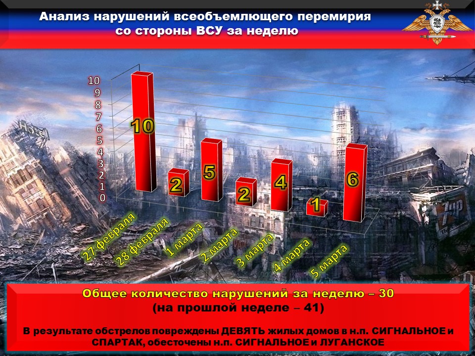 Традиционно увеличение провокационных обстрелов со стороны ВСУ происходило в преддверии и в ходе проведения заседаний Контактной группы по урегулированию конфликта. При этом для обстрелов н. п. Ленинское и Сигнальное боевики размещали огневые позиции минометов в жилых массивах населённых пунктов Водяное, Славное, трусливо прикрываясь местными жителями, используя их в качестве «живого щита».