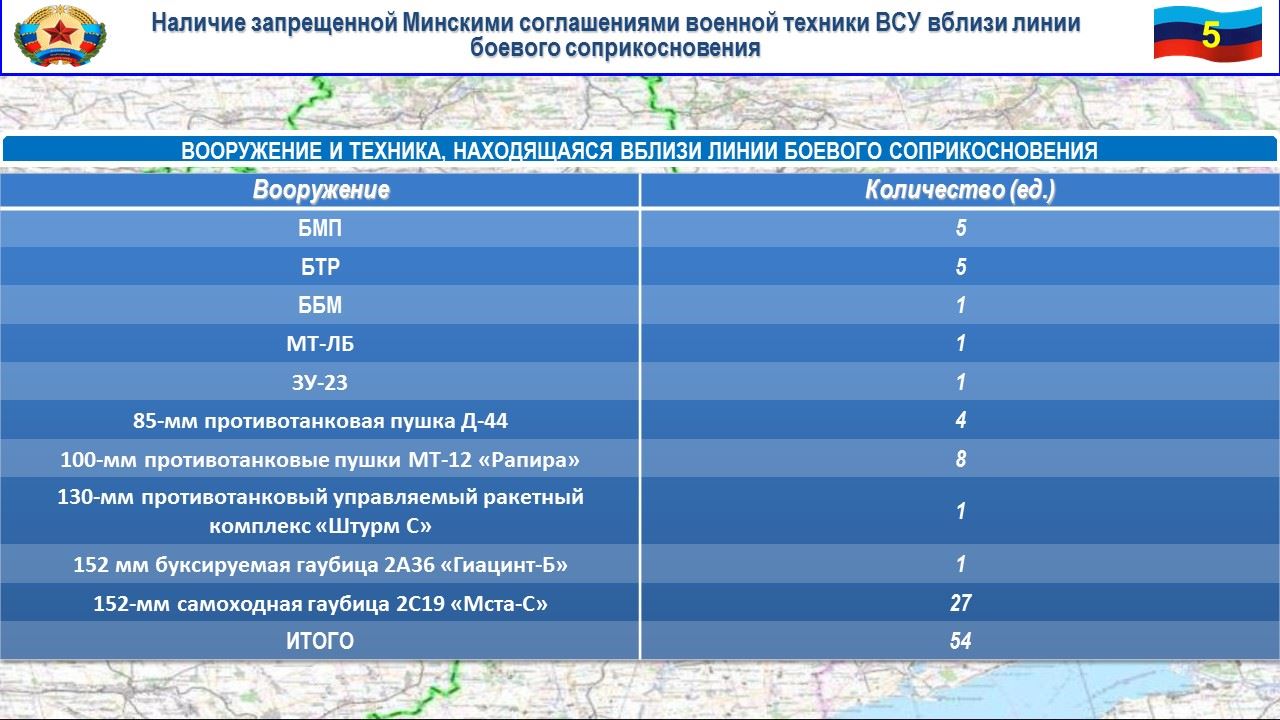 За истекшую неделю нашей разведкой выявлено размещение пятидесяти четырех единиц техники в жилых кварталах населенных пунктов: из состава 14 омбр: одна боевая машина пехоты в жилом районе н. п. Муратово; одна боевая машина пехоты вблизи жилого дома в н. п. Новотошковское; три БМП-1, одна БМП-2 и один МТ-ЛБ в жилом районе н. п. Орехово. Из состава 92 омбр: один БТР-4 «Буцефал» в жилом районе н. п. Золотое-2.