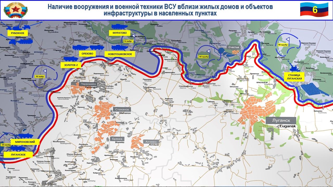 Из состава 80 одшбр: одна ЗУ-23 во дворе жилого домовладения в н. п. Станица Луганская. Из состава 59 омпбр: три бронетранспортера вблизи жилых домов в н. п. Мироновский; одна боевая бронированная машина в жилом районе н. п. Луганское. Из состава 40 оабр: четыре противотанковые пушки Д-44, одна 152 мм буксируемая гаубица «Гиацинт-Б» и двадцать семь 152-мм самоходных гаубиц «Мста-С», один противотанковый ракетный комплекс «Штурм-С» и восемь 100-мм противотанковых пушек «Рапира» на ж/д станции в н. п. Рубежное.