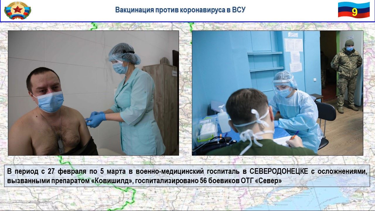 Так, наш источник сообщил, что в период с 27 февраля по 5 марта в военно-медицинский госпиталь в Северодонецке с осложнениями, вызванными препаратом «Ковишилд», госпитализировано 56 боевиков ОТГ «Север».