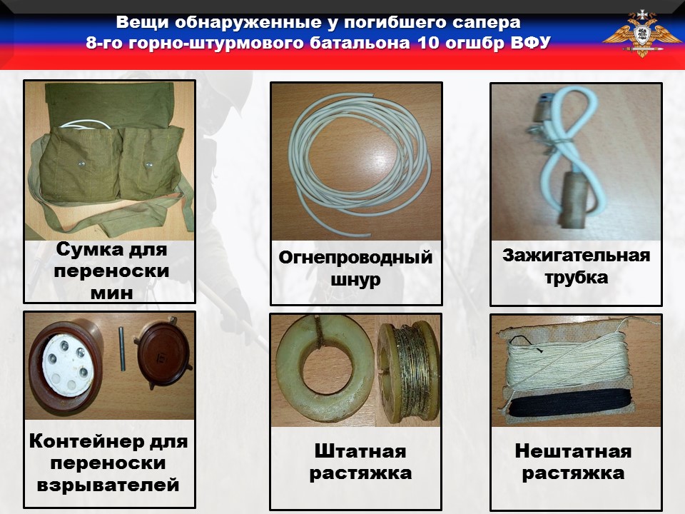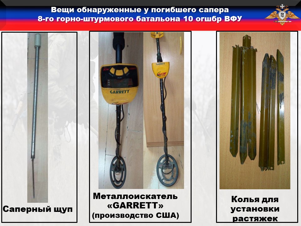При нем были обнаружены саперный щуп и миноискатель, а также приспособления для минирования местности.