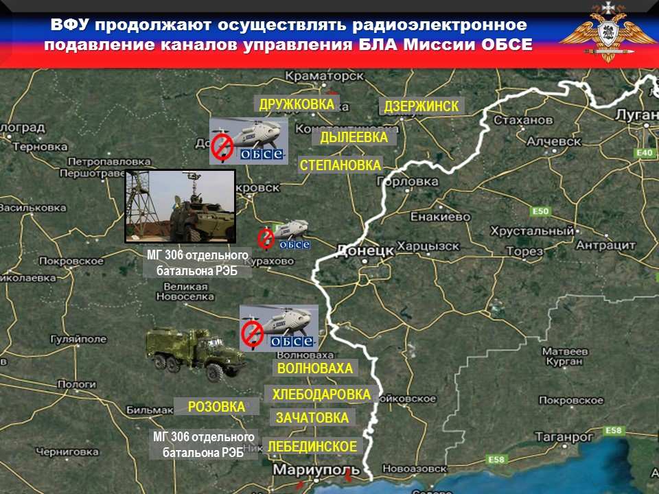 С целью недопущения обнаружения запрещенного вооружения 10, 36, 59 и 58-й бригад, отмечено активное применение станций радиоподавления «Буковель-АД» из состава мобильных групп 305-го батальона РЭБ и роты РЭБ 36-й обрмп в районах одиннадцати населенных пунктов: Степановка, Богдановка, Крымское, Дылеевка, Розовка, Хлебодаровка, Лебединское и Дзержинск, а также в районах железнодорожных станций Дружкова, Волноваха и Зачатовка.