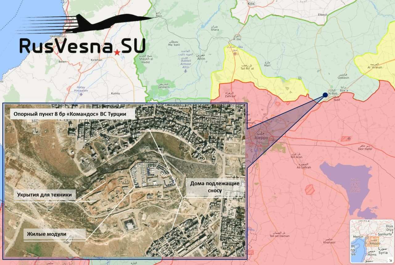 Подтвердились ранее полученные органами госбезопасности САР сведения о том, что 8-я бригада «Коммандос» 6-й мотопехотной дивизии ВС Турции приступила к расширению опорного пункта в районе города Эль-Баб на севере провинции Алеппо.
