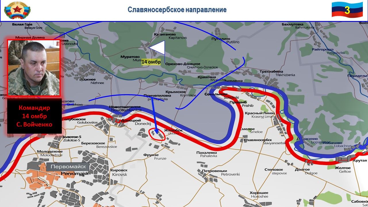 На славяносербском направлении по приказу командира 14 бригады Войченко с позиций, расположенных вблизи н.п. Причепиловка, был отрыт огонь из 82-мм минометов в направлении н.п. Желобок. Всего было выпущено одиннадцать мин.
