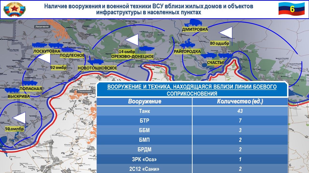 ► один зенитно-ракетный комплекс 9К33 «Оса» вблизи жилых домов н.п. Райгородок; два буксируемых миномета 2С12 «Сани» вблизи н.п. Дмитровка; три бронетранспортера «БТР-80» и одна бронированная разведывательно-дозорная машина БРДМ-2 в жилом районе н.п. Счастье.