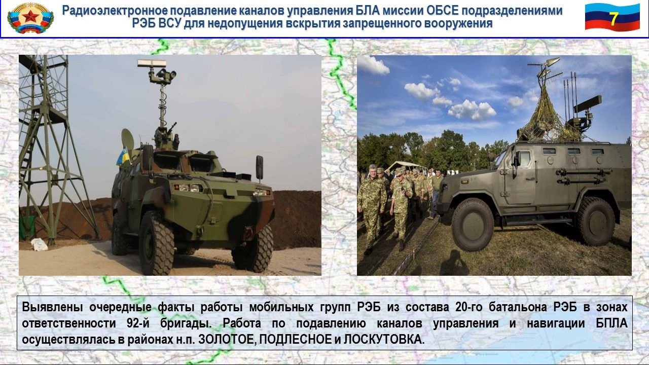 Согласно указаниям командования «ООС» подразделения РЭБ, с целью сокрытия фактов размещения запрещенной военной техники, продолжают радиоэлектронное подавление каналов управления БЛА миссии ОБСЕ.