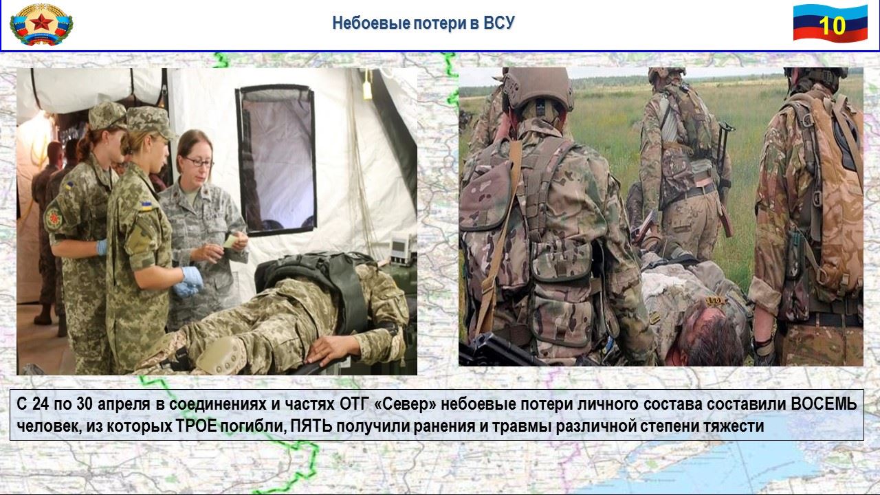 По данным нашей разведки, с 24 по 30 апреля в соединениях и частях ОТГ «Север» небоевые потери личного состава составили восемь человек, из которых трое погибли, пять получили ранения и травмы различной степени тяжести: