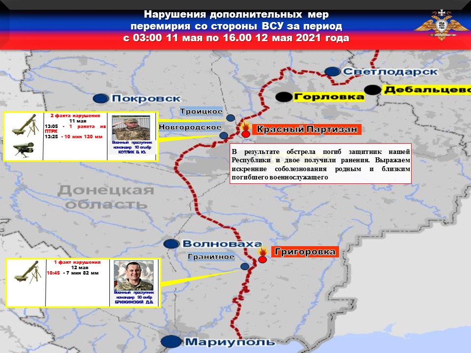 За прошедшие сутки, с 11 на 12 мая, со стороны украинских боевиков зафиксировано два нарушения второго пункта Комплекса дополнительных мер по контролю над соблюдением режима прекращения огня.
