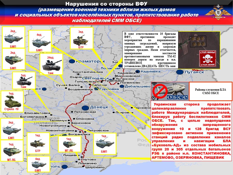 В нарушение третьего пункта дополнительных мер выявлено размещение 50-ти единиц военной техники ВСУ вблизи жилых домов и муниципальных объектов на подконтрольной Украине территории.