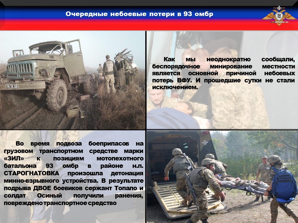 Во время подвоза боеприпасов на грузовом транспортном средстве марки ЗИЛ к позициям мотопехотного батальона 93-й омбр в районе н. п. Старогнатовка произошла детонация минно-взрывного устройства.