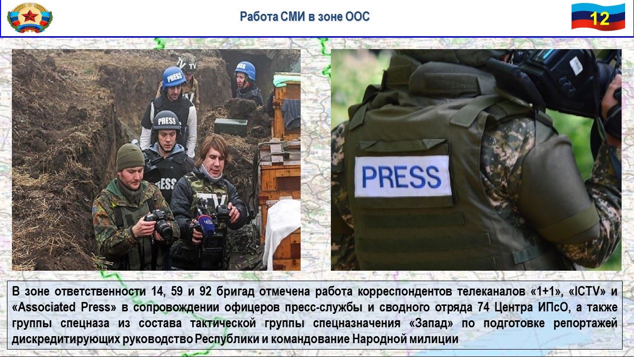 Так, в зоне ответственности 14, 59 и 92-й бригад работали корреспонденты телеканалов «1+1», ICTV и Associated Press в сопровождении офицеров пресс-службы и сводного отряда 74-го Центра ИПсО, а также группы спецназа из состава тактической группы спецназначения «Запад» в районах населенных пунктов Светлодарское, Новолуганское, Попасная, Крымское и Трехизбенка.