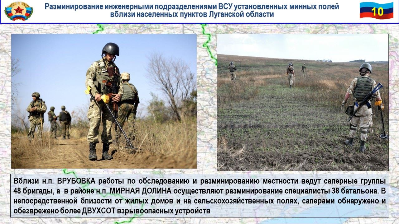 По имеющимся у нас сведениям, в зоне ответственности 14-й бригады ВСУ вблизи н. п. Врубовка работы по обследованию и разминированию местности ведут саперные группы 48-й бригады, а в районе н. п. Мирная Долина осуществляют разминирование специалисты 38-го батальона.