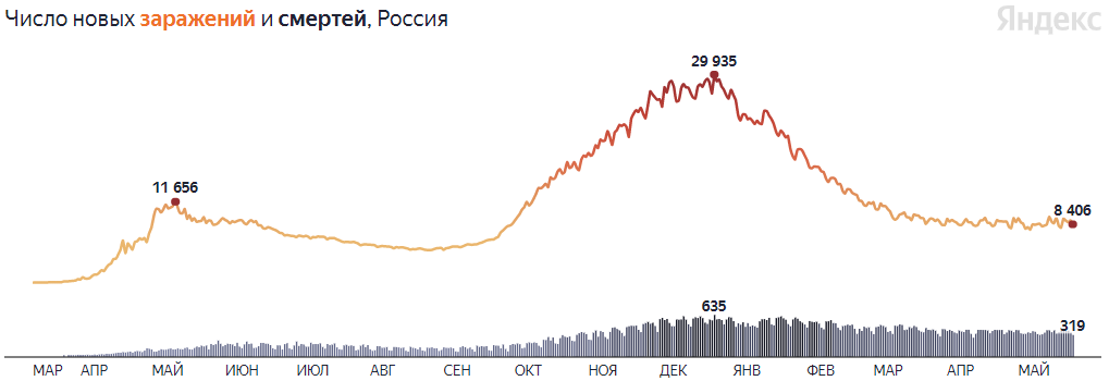За сутки в нашей стране скончались 319 человек с тяжёлой формой COVID-19 (минимальное число умерших за сутки с 13 апреля).