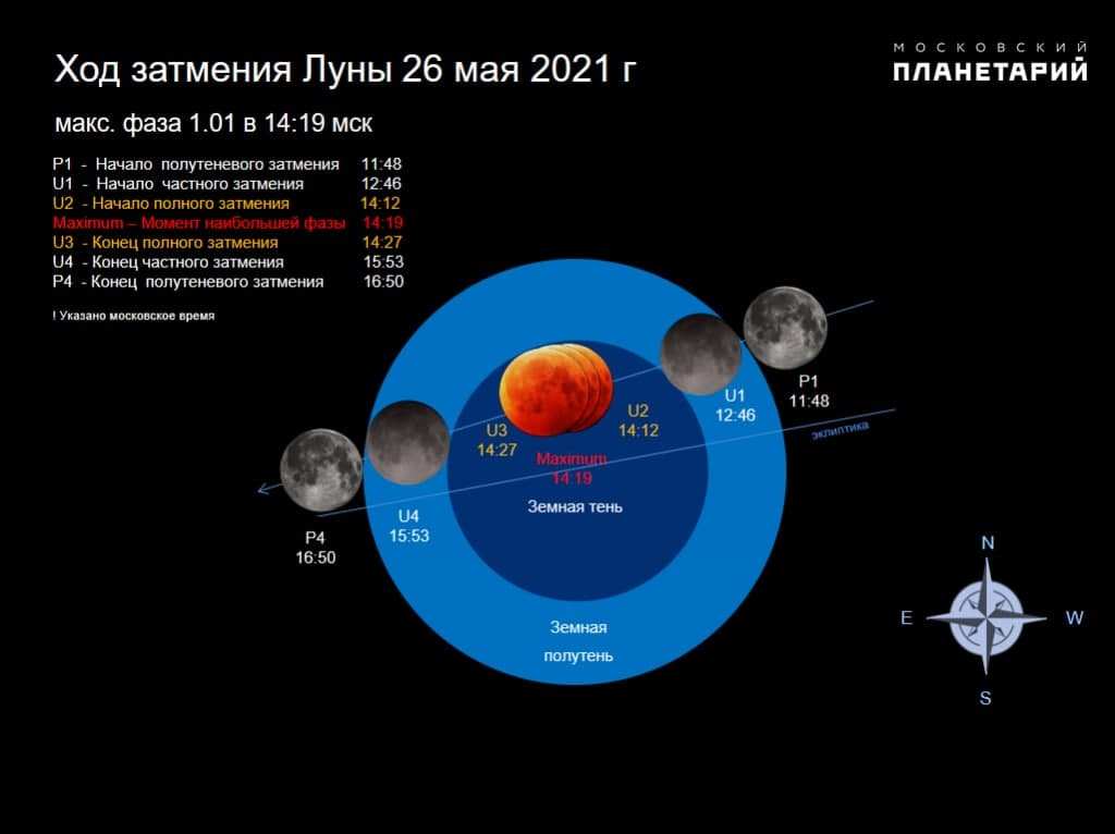Общее время от входа Луны в полутень Земли до выхода из нее составит 5 часов и 2 минуты, но само затмение продлится 14 минут и 19 секунд.